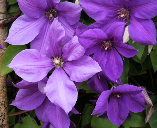 C. 'Błękitny Anioł' BLUE ANGEL [C. viticella 'Blue Angel'] - pale blue flowers with greenish-yellow stamens. C. 'Comtesse de Bouchaud' - pink flowers with creamy stamens. C. 'Gipsy Queen' - vigorous cultivar with deep violet-purple flowers. It prefers a sunny position. C. 'Hagley Hybrid' - pale pink flowers that look their best if grown in shade. C. 'Honora' - violet-purple flowers shaded with burgundy. C. 'Huldine' [C. viticella 'Huldine'] - vigorous cultivar with pearly-white flowers of 7-10 cm in diameter and yellow stamens. C. 'Jackmanii' - ever-popular vigorous climber with dark violet-blue flowers is the oldest large flowered cultivar, bred in 1858. Susceptible to powdery mildew. C. 'Kardynał Wyszyński' - intense red flowers with reddish-brown stamens. C. 'Polish Spirit' [C. viticella 'Polish Spirit'] - exceptionally long flowering cultivar with handsome, small, deep green leaves and crimson-violet flowers of 7-10 cm. C. 'Prince Charles' [C. viticella 'Prince Charles'] - compact cultivar with pale blue flowers of 8-13 cm and pale yellow stamens. C. 'Semu' - light purple to violet-blue flowers which fade as they open. As the flowers slightly hang down they show a darker centre. C. 'Victoria' - very hardy, vigorous cultivar with violet flowers and greenish-yellow stamens.