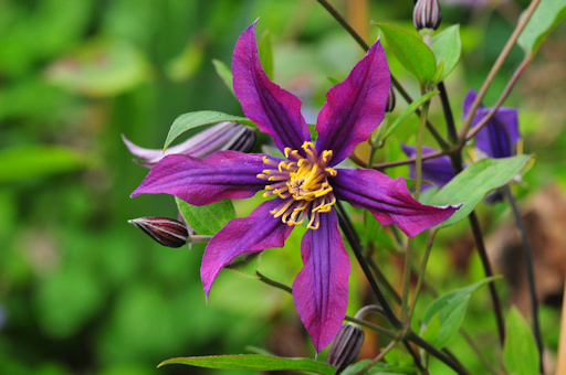 C. 'Zomisri' MISSISSIPPI RIVER grows up to 1.5-2 m and has integrifolia blood. The flowers are 6-8 cm in diameter with 6 glossy sepals. Initially the flowers are half-nodding. The color of the flower is dark violet with a purple tint when open. The flowers have violet stamens with very striking gold-yellow anthers.