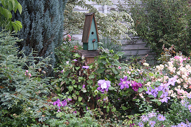 For the past 20 odd years Dave and Pat Eckhardt have lived in what used to be an old (1893) coaching house, though it has been quite extensively extended and modified. Even as one walks through the gates, their loves of plants in general and clematis in particular is evident. With the greetings over, we were let loose to discover what makes this so special a garden.